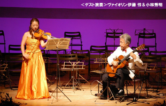 Notes(生田直基/代表)は、積極的なレパートリー「spin(A.ヨーク)」を披露し、今後期待される新星となった。女性重奏団WINGは、「午後の旅立ち~夢の中のウェディング(セネヴィル&トゥッサン~小林編)」を優雅な演奏とドレスで魅了した。岐阜ギター合奏団(川瀬啓嗣/指導)は、多彩なギターサウンドを毎年発表していて注目されていたが、飽きない選曲で期待通りだった。桑名ギターアンサンブル(伊藤博之/指導)は、モーツァルトの「パントミーム」など明るく楽しい曲を演奏。名古屋市民ギターオーケストラ(小林秀明/指導)は、バロック音楽「幸せのガボット(ヘンデル)」とヴァイオリンコラボで「情熱大陸(葉加瀬太郎~小林編)」をパワフルに演奏した。ゲストは昨年に続きヴァイオリン伊藤怜さんと小林とのコラボで「チャルダッシュ」など華を添えた。エンディングは、恒例の参加者有志による合同スペシャルギターオーケストラで「スパニッシュコーヒー(F.ミルズ)」をスリリングに演奏した。