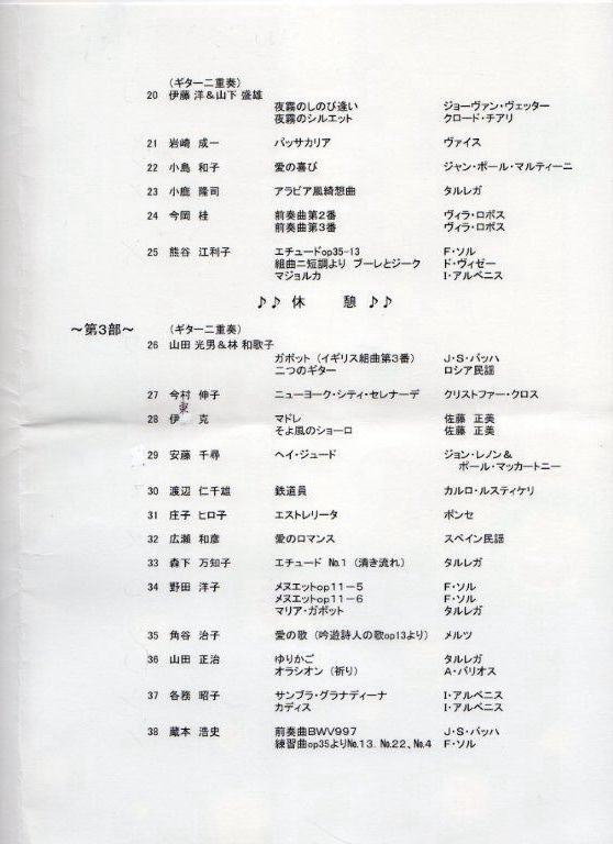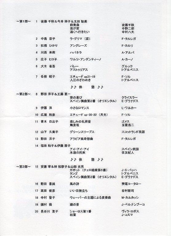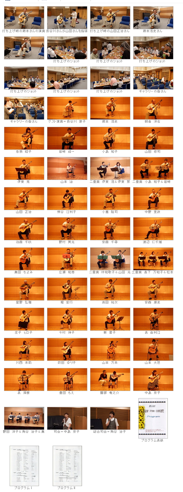 今回は演奏参加者が非常に多く盛会裏に無事終了しました。昨年と比べると38組の参加、そして聴衆の方を入れると約70名でした。7歳〜13歳の子供たちの演奏もあり、ギターの普及にも今後期待が持てます。名演奏有り、迷演奏有り昨年同様、和気あいあいのムードで、適当な緊張感もあり実行委員長の工藤さんも大変お疲れでしたが、満足なコンサートでした。参加者の多い割には順調に進み、最後の打ち上げも例年の如く各自が自由に重奏やら独奏で大変盛り上がり、午後8時は無事に終了でできました。コンサートの最後には理事の長谷川 恵子さんが一段と気合に入った演奏を披露して頂き、アンコールの声も掛かり非常に良いコンサートでした。<朝倉洋右>