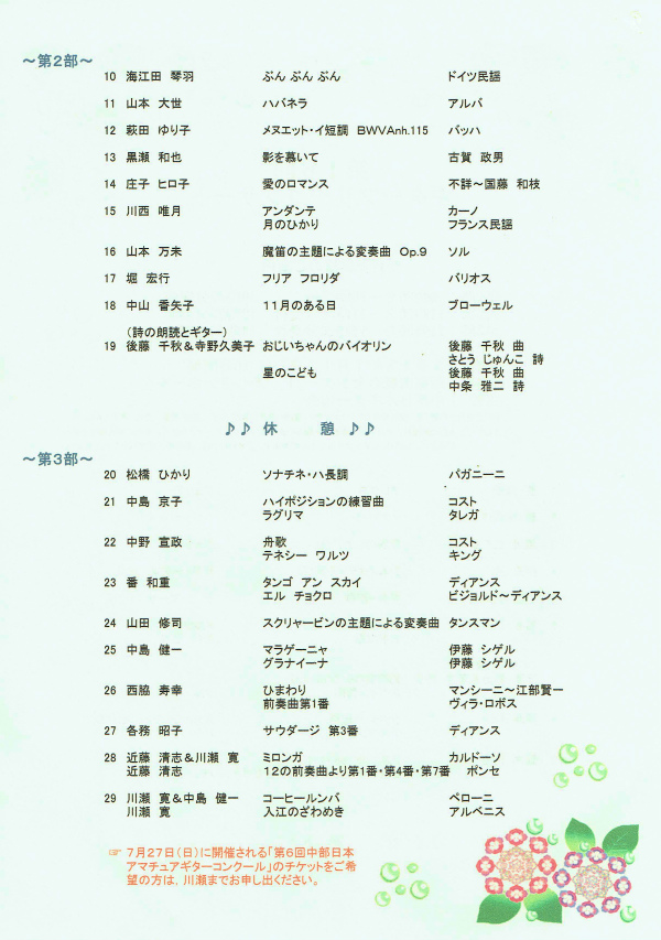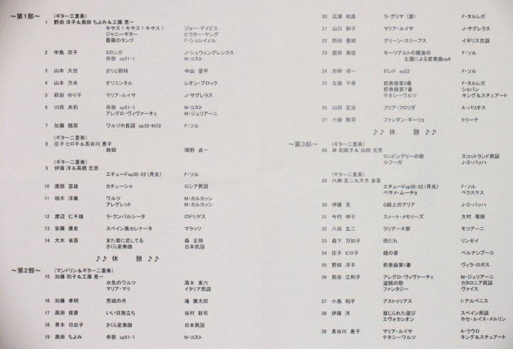 さて、フリーコンサートは、中部日本ギター協会が主催するイヴェントの中で、演奏者、聴衆者にかかわらず、一番参加しやすいイヴェントではないでしょうか。また、協会員以外の方にも門戸を開き、「ギター教授者、演奏家および愛好者がギター音楽の楽しさ、素晴らしさを共有し、お互いの技術、音楽性の向上を目指すとともに〜(以下略)」と謳われた規約の第1条を、そのまま現実化するイヴェントとも言えます。さらに、各地で開催される関係上、地元の協会員でお世話申し上げるのが自然であり、今後愛知県でも、三重県でも開催されることを願う次第です。進行方法は、全体を3部に分け、各部ごとに「受付 → リハーサル → 本番」の順に、3回繰り返す方法でした。冒頭のご挨拶でも申し上げましたが、これがベストの方法だと考えているわけではなく、今年の経験を踏まえ、皆様のご意見を承りながら、より参加しやすいイヴェントになるよう試行錯誤していくつもりです。