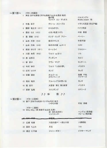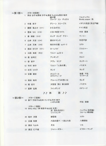詳細はプログラムを参照していただくとして、個人的な感想を一つ述べます。それは、子供さんの演奏がすがすがしかったということです。きっと欲がないから、あんなに純粋な演奏ができるのでしょうね。自分の周りに「リトル ギタリスト」がいないこともあって、新鮮な感動を頂きました。