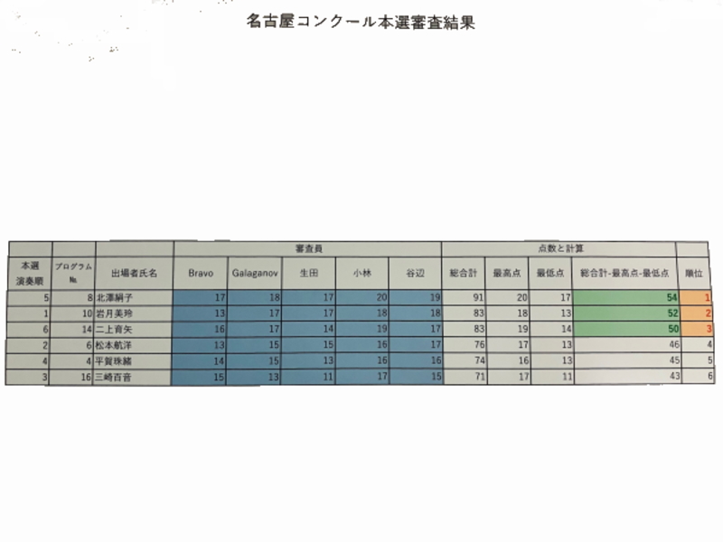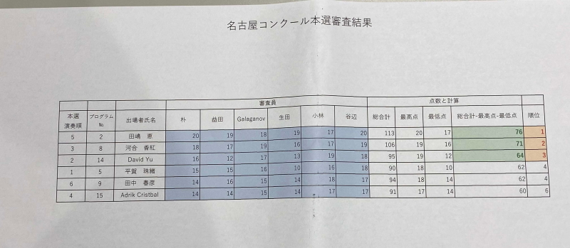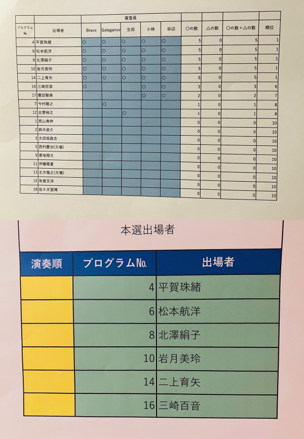 本選出場者� 第一位 田嶋 恵 集合写真 第二位 河合 香紅 第三位 David Yu 第四位 平賀 珠緒 第四位 田中 春彦 第六位 Adrik Cristbal ゲスト演奏 岩槻 美玲 集合写真